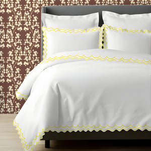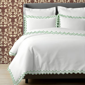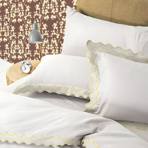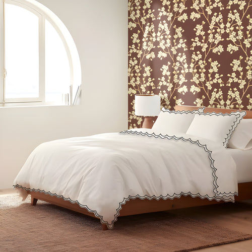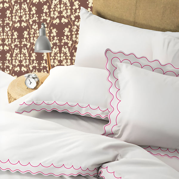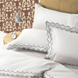 • Features fabric trim & embroidery scalloped piping all around to pillow sham and duvet cover