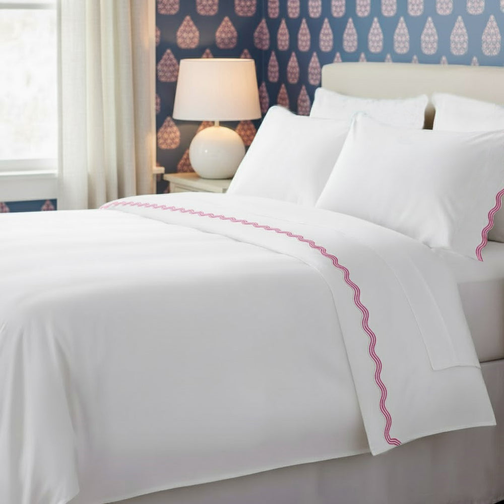 • Features fabric trim & embroidery scalloped piping all around to pillow sham and duvet cover
